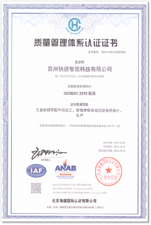 截止2025年,快捷智能已榮獲國(guó)家高新技術(shù)企業(yè)、科技型中小企業(yè)、瞪羚企業(yè)、專精特新中小企業(yè)、企業(yè)技術(shù)中心等多項(xiàng)榮譽(yù),通過(guò)質(zhì)量管理體系認(rèn)證等多項(xiàng)企業(yè)和產(chǎn)品認(rèn)證。